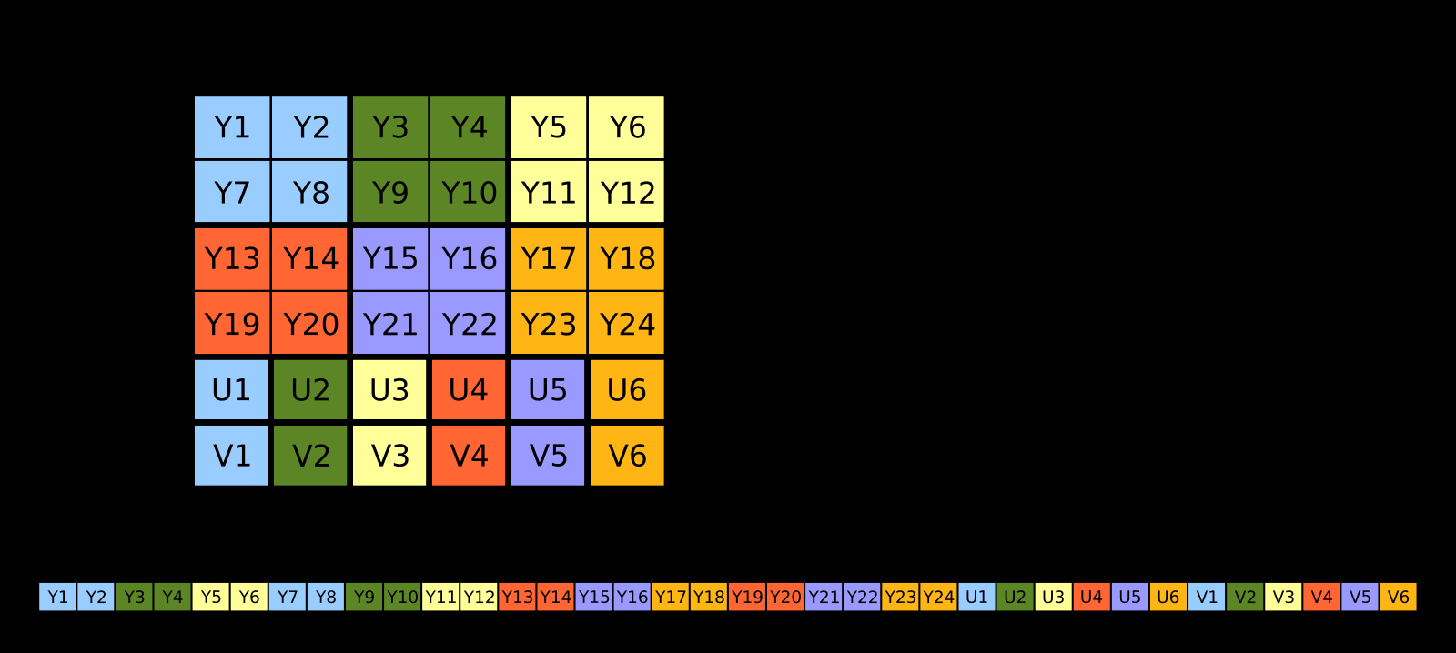 I420 的采样比是 4:2:0,它是 planar 存储方式,分量存储顺序依次是 Y, Cb, Cr,例如下图表示了宽为 6 像素、高为 4 像素图像的三种分量存储方式:
