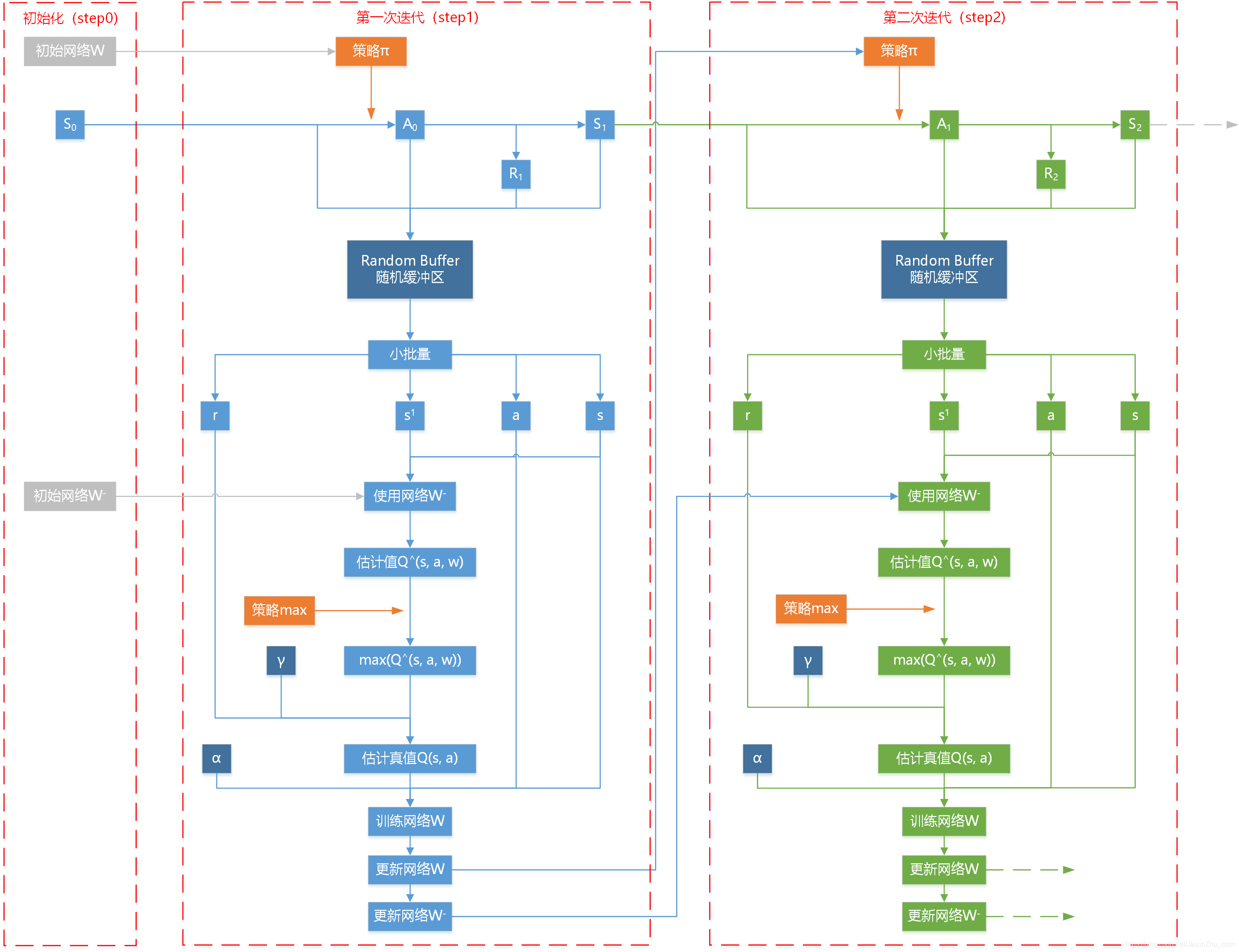 3、除初始化环节,每个迭代循环分为两大步操作,以随机缓存区为分界,上部为采样环节(sample,提供新的数据),下部为学习环节(learn:选取小批量数据进行学习,优化网络参数)