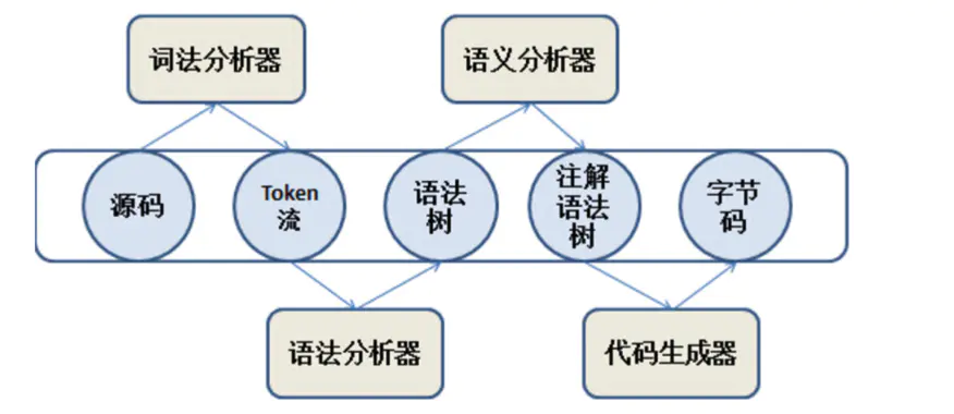 在编译期,将java代码翻译为字节码文件的过程经过了四个步骤,词法分析,语法分析,语义分析,代码生成四个步骤。