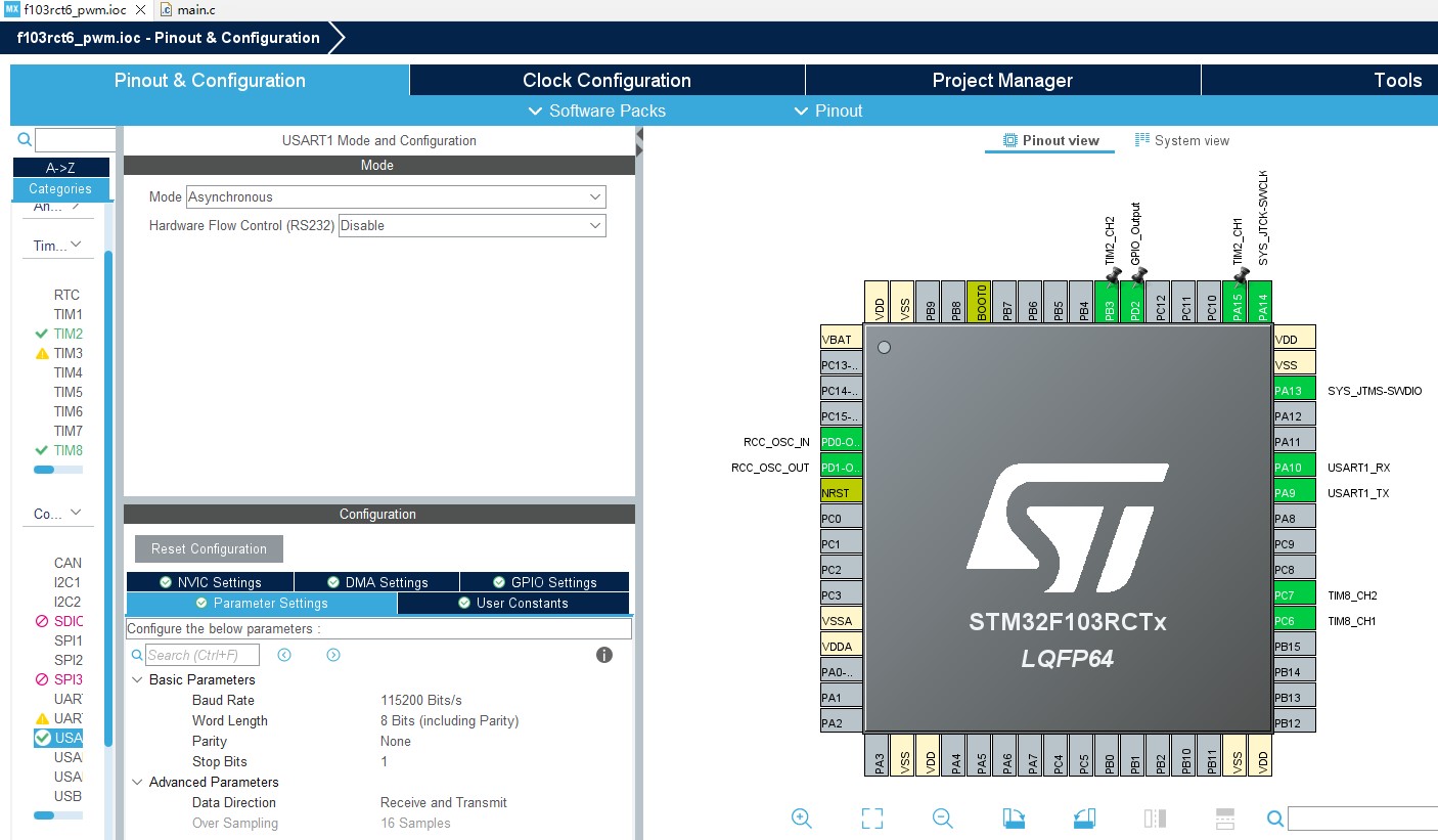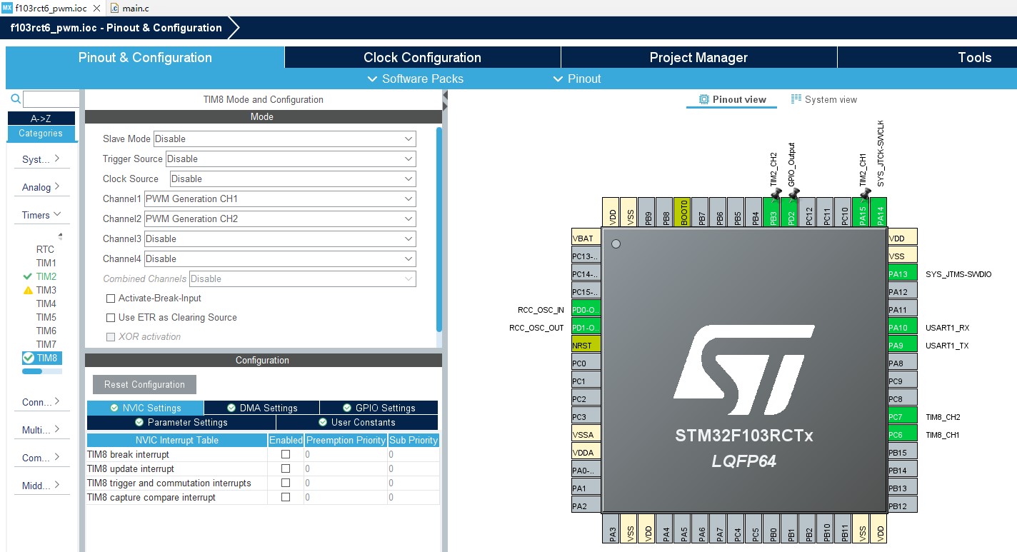 3.STM32CubeIDE中CubeMX配置TIM2、TIM8和USART。