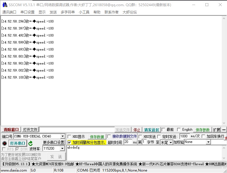 5.通过串口工具SSCOM,可以看到串口输出结果,负号是转速方向,单位为每分钟转速。