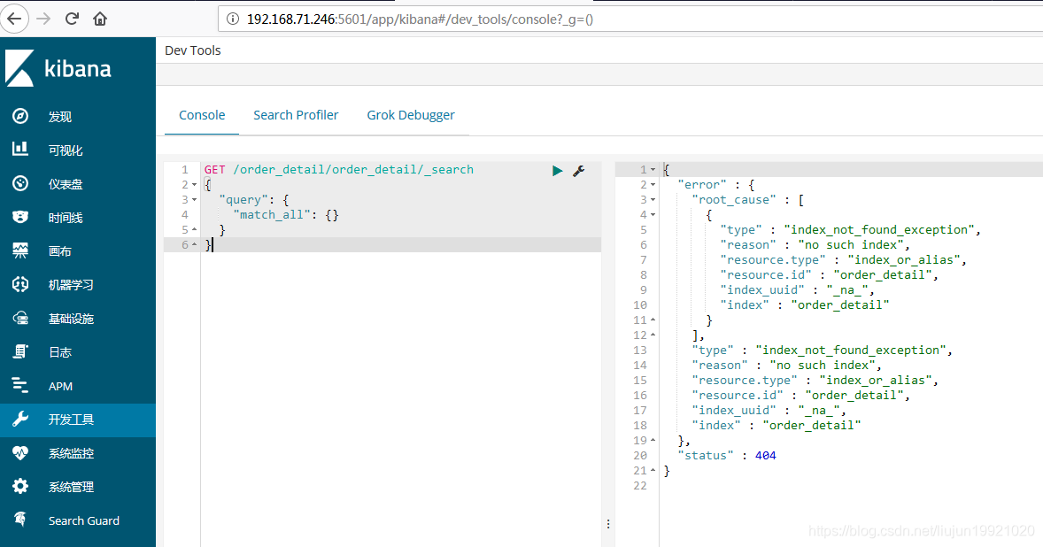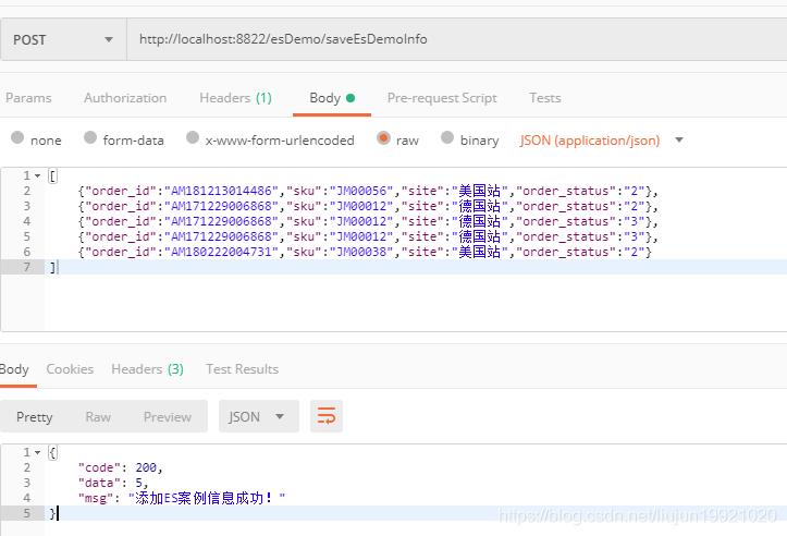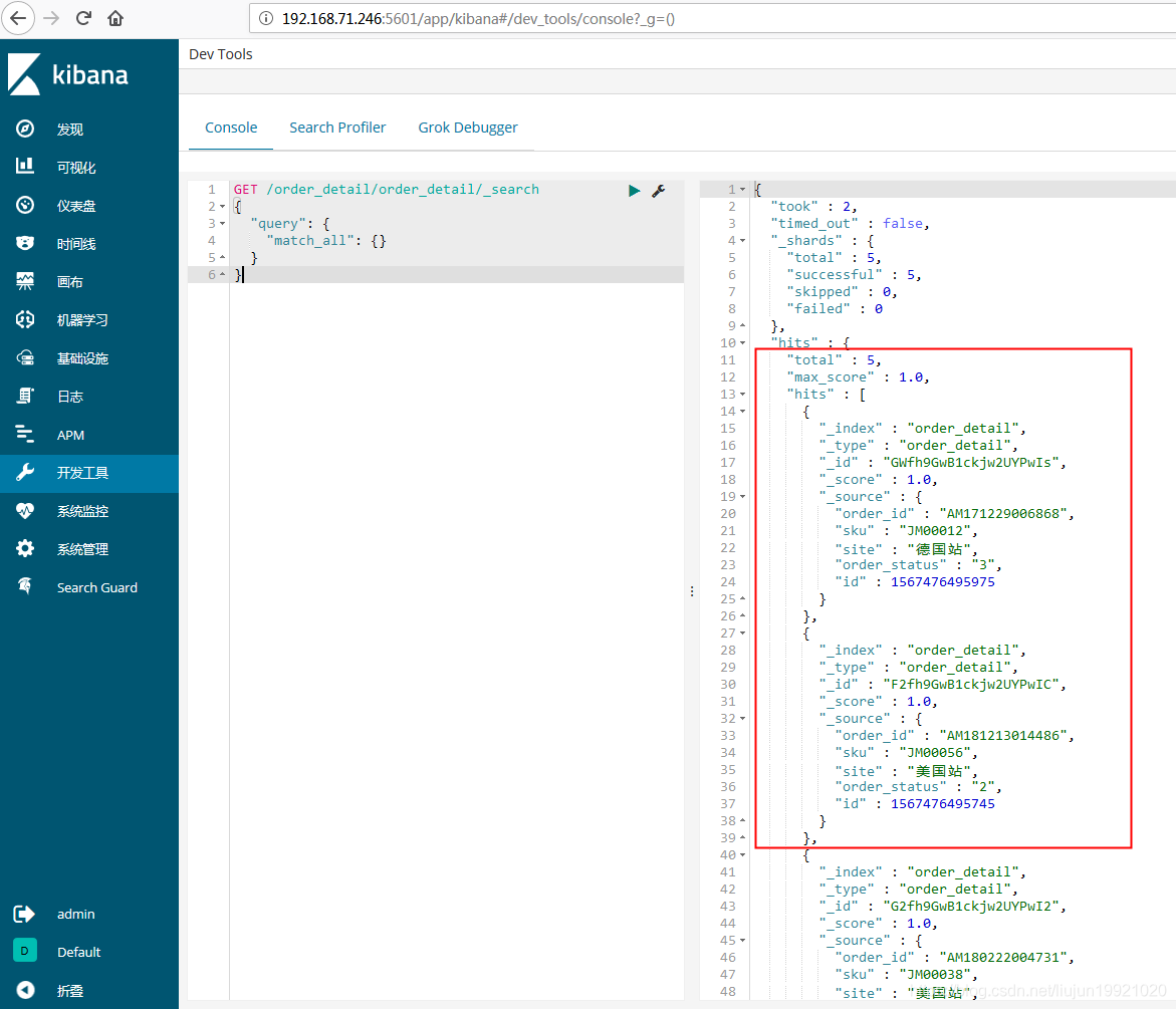 通过接口传递list对象,将集合数据插入ES索引名/类型名为”order_detail”对象中;然后再通过接口按条件查询。