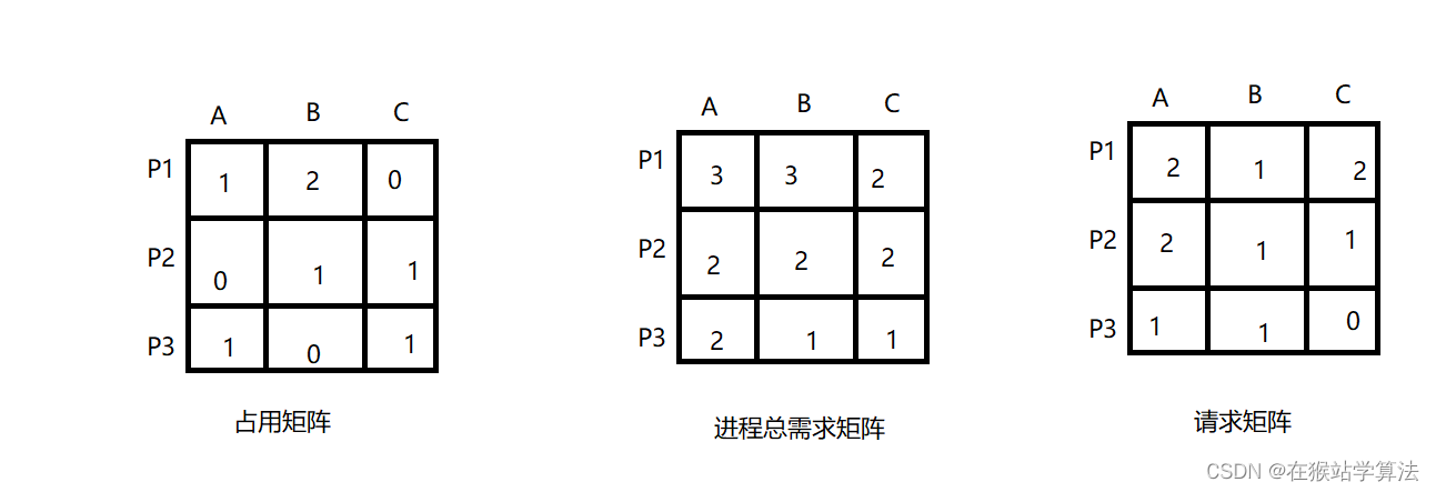 3、进程占用资源情况矩阵:进程在其生命周期内的占用资源情况