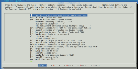 - System configuration:系统配置,例如根文件系统框架,目标系统hostname,bash,root密码等。