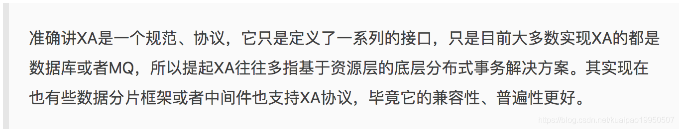 其实也并非不用,例如在IBM大型机上基于CICS很多跨资源是基于XA协议实现的分布式事务,XA也事实上算分布式事务处理的规范了,但在为什么互联网中很少使用,究其原因我觉得有几个: