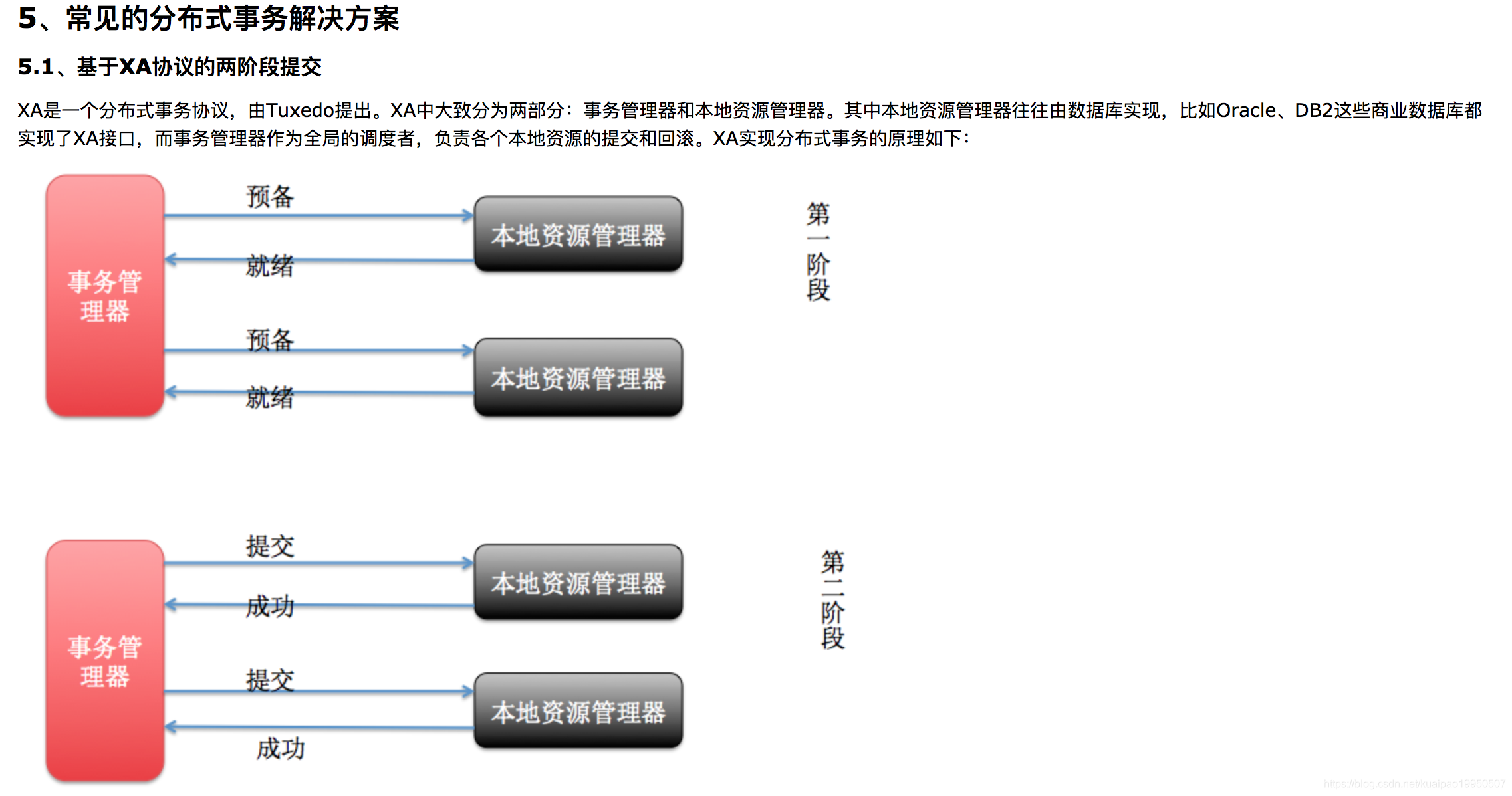 总的来说,XA协议比较简单,而且一旦商业数据库实现了XA协议,使用分布式事务的成本也比较低。但是,XA也有致命的缺点,那就是性能不理想,特别是在交易下单链路,往往并发量很高,XA无法满足高并发场景。XA目前在商业数据库支持的比较理想,在mysql数据库中支持的不太理想,mysql的XA实现,没有记录prepare阶段日志,主备切换回导致主库与备库数据不一致。许多nosql也没有支持XA,这让XA的应用场景变得非常狭隘。