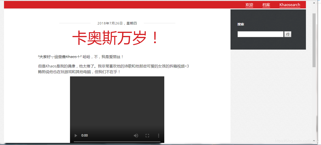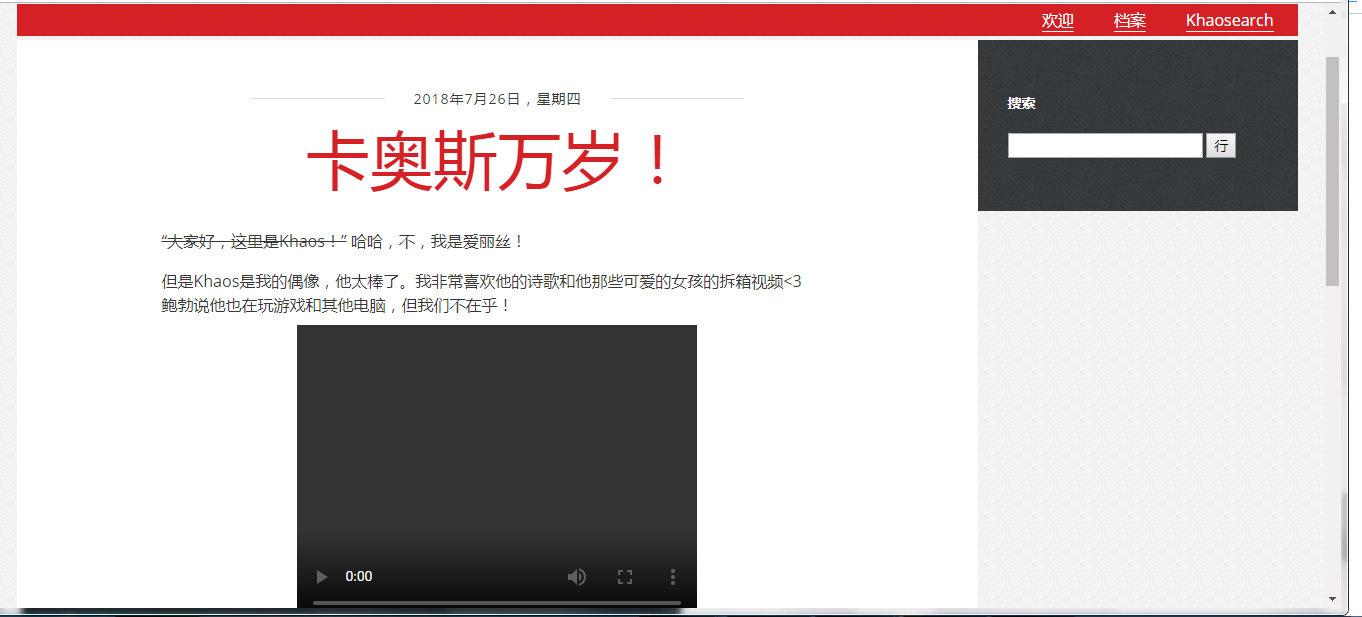 这显然是一个粉丝为自己的偶像设置的网站,我点了一下,前面几个欢迎,档案都没有什么有用的信息,重要的东西都在Khaosearch这个连接