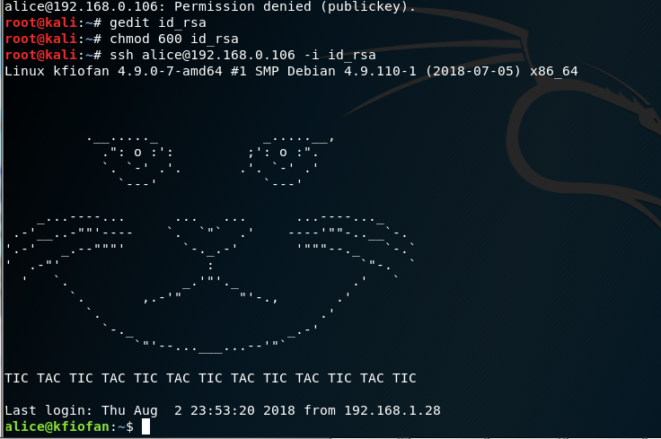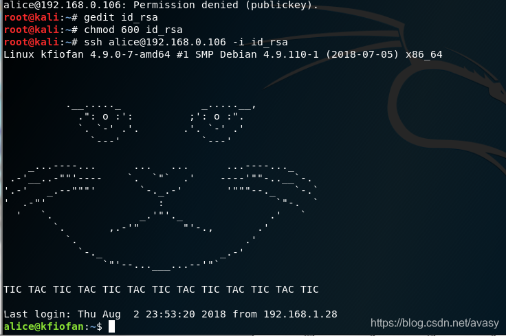 然后用ssh连接靶机,账号alice,密码用id_rsa
