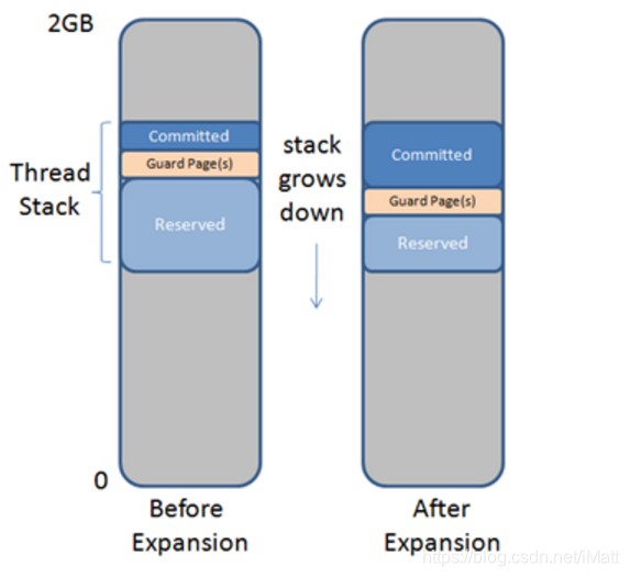 除了线程的基本信息(CPU寄存器状态,调度优先级,和资源使用统计信息)外,进程还会分配给线程地址空间给线程,称为堆栈。线程可以使用用来:储执函数参数,保持局部变量、函数返回地址等。这样,系统的虚拟内存就不会被不必要地浪费,只初始分配或提交了堆栈的一部分,其余部分则被保留。由于堆栈在内存中向下增长,系统将保护页面放置在堆栈内存之外,当访问该部分时,将触发额外内存的自动提交(称为堆栈扩展)。这张图显示了堆栈的提交区域是如何向下增长的,以及当堆栈扩展时保护页面是如何移动的,以32位地址空间为例(不是按比例绘制的):