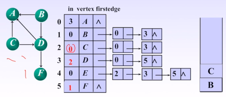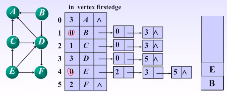//反复删除栈顶元素对应的顶点,直至不再存在入度为0的顶点。
