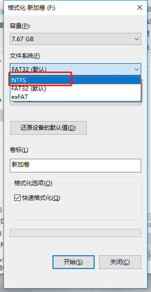 右击U盘格式化→选择文件系统(将文件系统的选项改为NTFS),然后选择快速格式化,最后确定即可