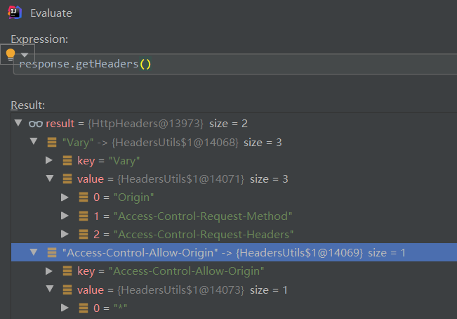 可以看到,在DefaultCorsProcessor 中,根据我们在appliation.yml 中的配置,给Response添加了 Vary 和 Access-Control-Allow-Origin 的头。