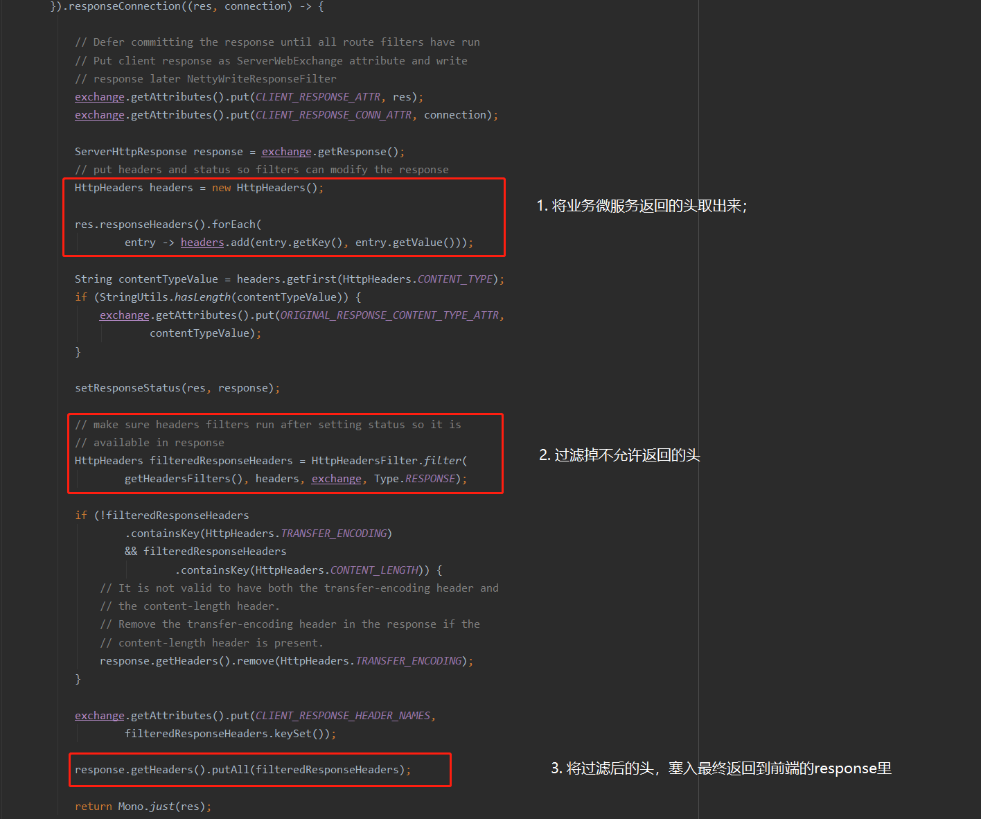 NettyRoutingFilter是负责实际将请求转发给后台微服务,并获取Response的,重点看下代码中filter的处理结果的部分:
