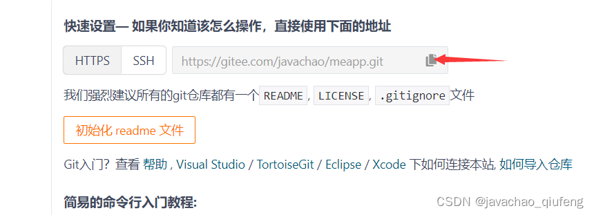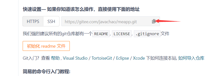 输入命令 git remote add orlgin https://gitee.com/javachao/meapp.git