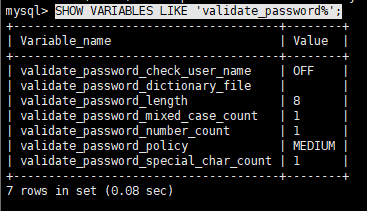 在mysql中输入:SHOW VARIABLES LIKE 'validate_password%'; 查看mysql安全策略