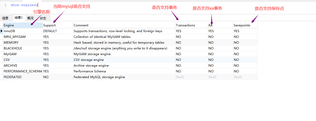 MySQL 有多种存储引擎,每种存储引擎有各自的优缺点(第3节说)。可以使用命令“show engines”查看引擎(下图附命令以及显示内容)。
