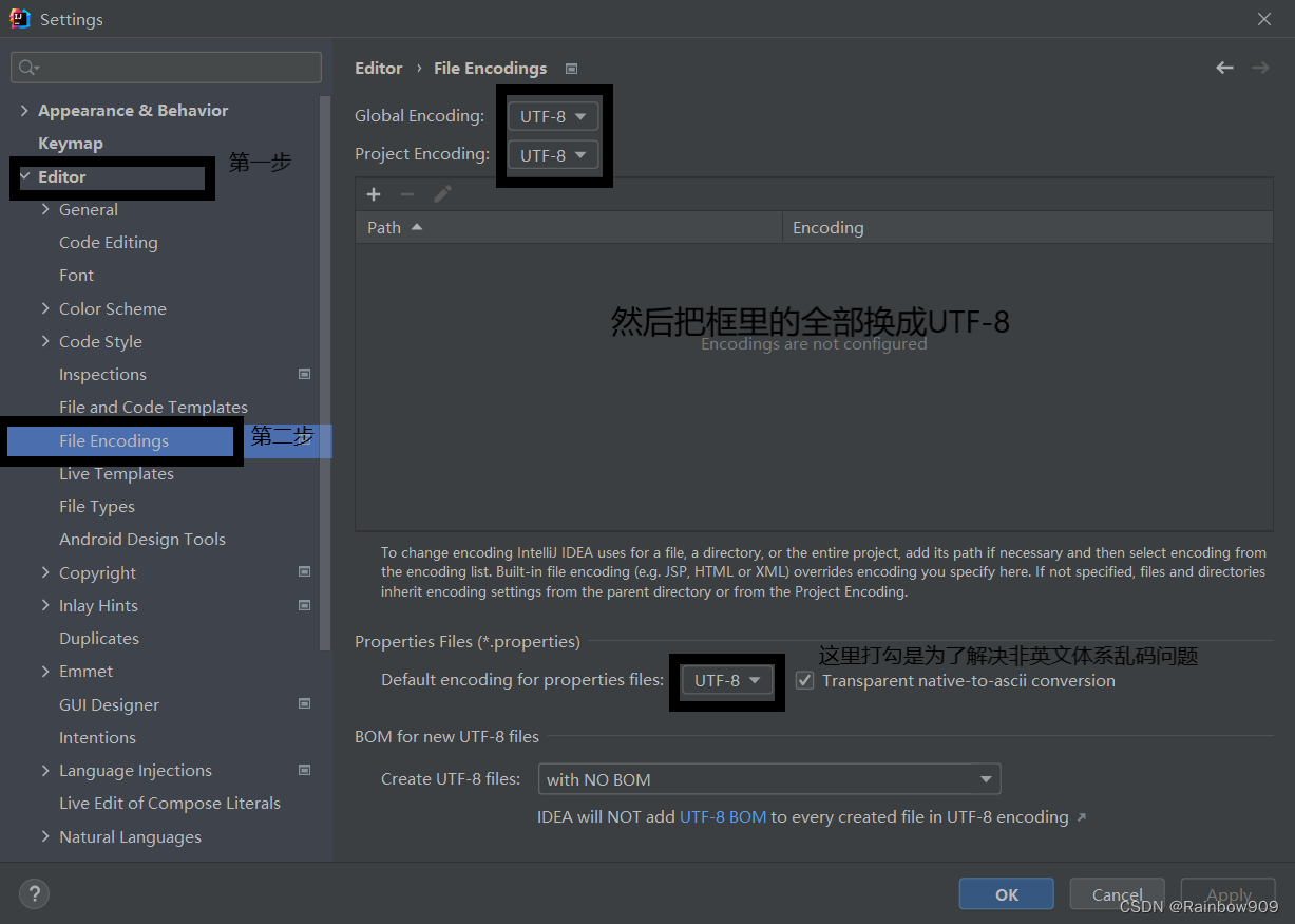 2、第二步:选择Editor下的File Encoding将框内的全部换成UTF-8。注:打勾那里是为了解决非英文乱码问题