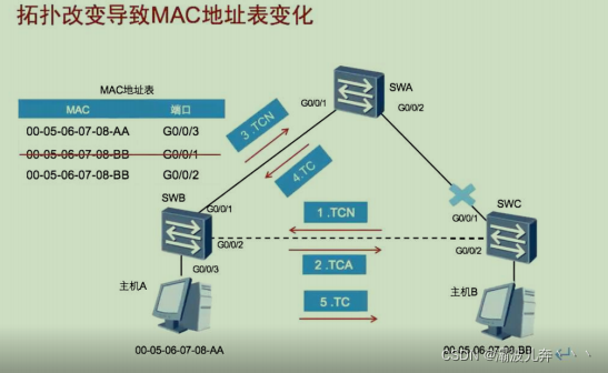 而邻居交换机在收到TCN BPDU数据包后,会先将数据包中的TCA标记位置1然后转发回复给故障设备(通过转发修改BPDU)目的是用于可靠传输。之后再逐级转发TCN BPDU到根网桥,根网桥再通过发送TC标记位置为1的BPDU包给所有交换机(目的:让STP网络中的所有交换机的MAC地址表的老化时间临时从300s修改为15s)