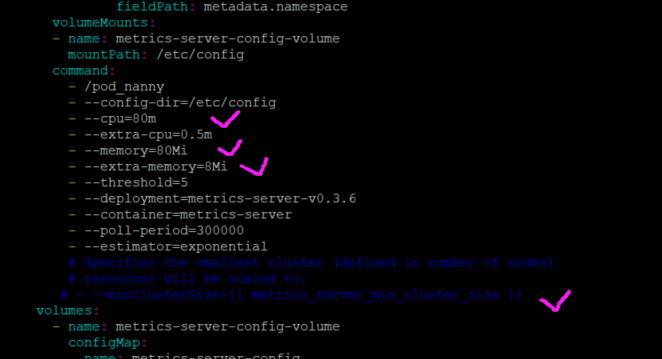 addon-resizer的command中写上具体的cpu、memory、extra-memory的值,注释掉minClusterSize={{ metrics_server_min_cluster_size }}