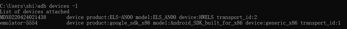 要是不确定哪个是你的手机,可以这样:adb devices -l (小写L) 就都能看到了。显示这样: