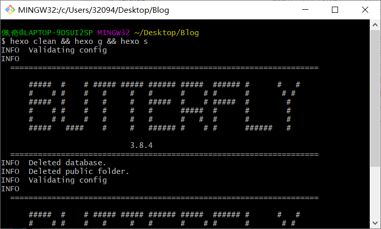 - 此时只需要在自己的博客主目录打开gitbase输入hexo clean && hexo g && hexo d 完成推送即可