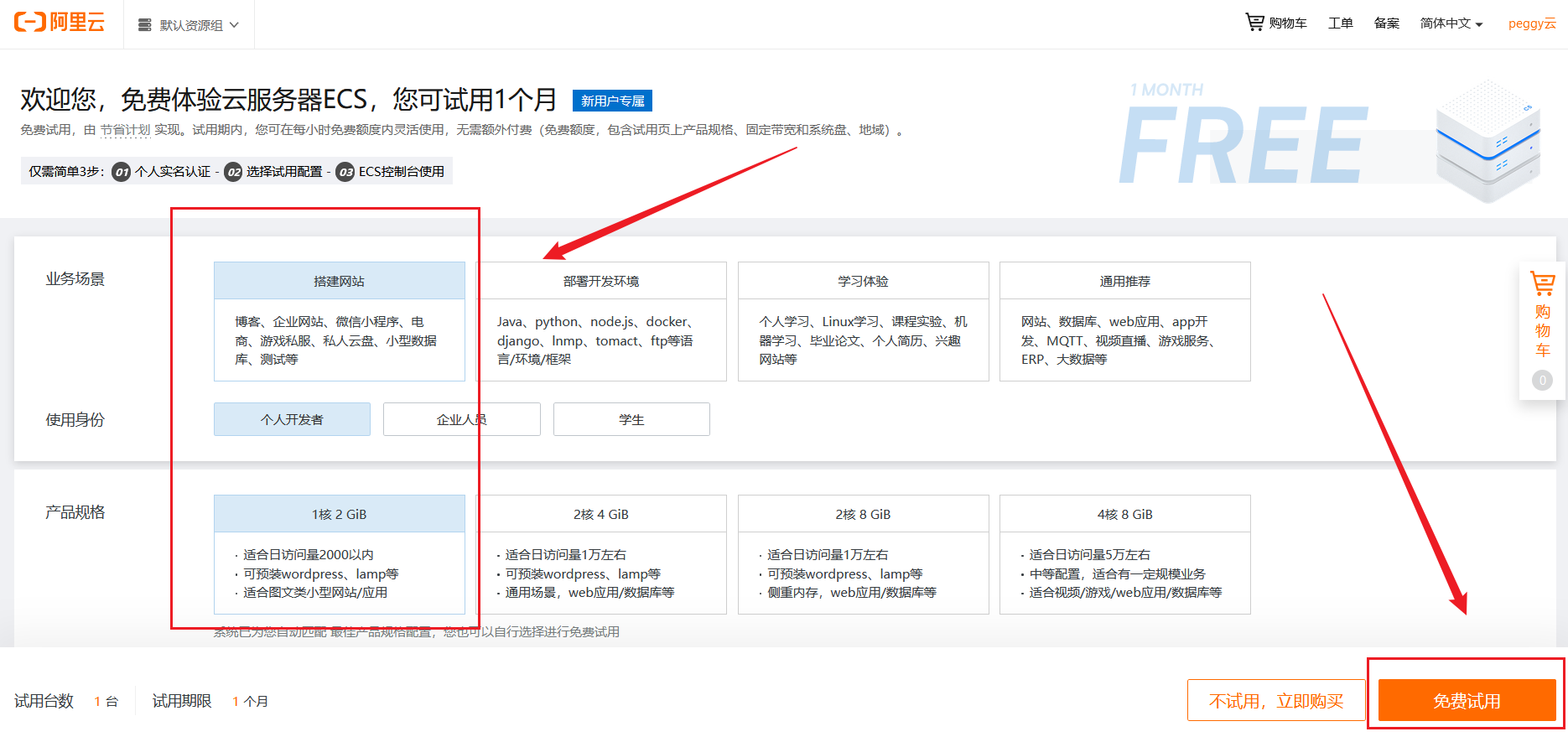 此时便就有一款为期一个月的免费版云服务器