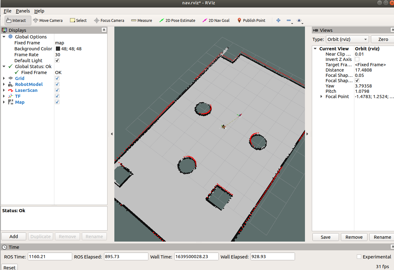 最后,就可以通过键盘控制gazebo中的机器人运动,同时,在rviz中可以显示gmapping发布的栅格地图数据了,下一步,还需要将地图单独保存。
