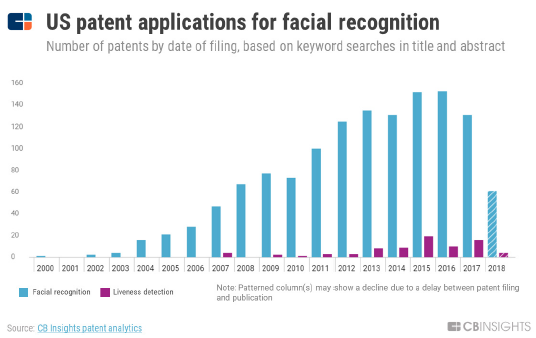SenseTime,Face ++和最近的CloudWalk等独角兽已经从中国涌现。(这是我们有关中国的详细报告。)但根据CB Insights专利分析工具,即使在美国,对该技术的兴趣也在激增。