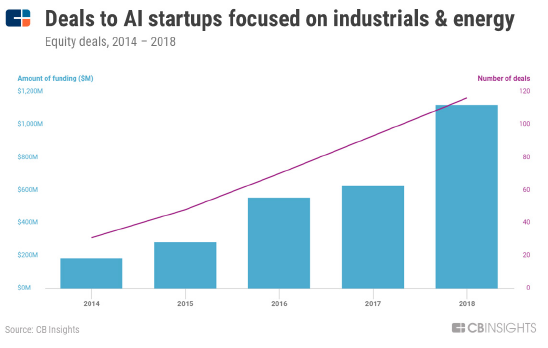 与专注于工业和能源的AI公司的交易正在增加,其中包括用于IIoT的ML即服务平台。较新的初创公司正在与C3 IoT和Uptake Technologies等独角兽竞争。