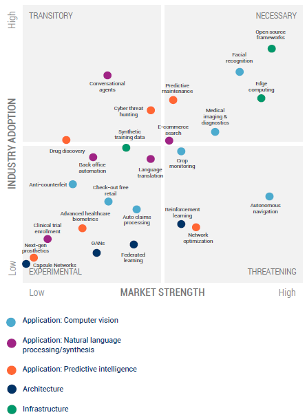 行业采用(Y轴):包括该领域中的初创公司的发展势头,媒体的关注度,客户采用率(合作伙伴关系,客户,许可交易)。