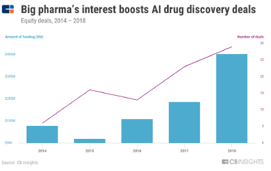 对这一领域的兴趣正在推动与AI药物研发初创公司进行股权交易的数量:截至2018年第二季度的20笔,与2017年全年持平。