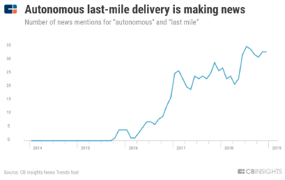 自主物流-特别是自主的最后一英里交付-对于零售商和配送公司来说是头等大事,并且可能是我们看到完全自主权的第一个领域。自动驾驶汽车可以帮助解决在最后一英里运送货物的昂贵而艰巨的挑战,这加起来几乎是一件商品总交货成本的三分之一。