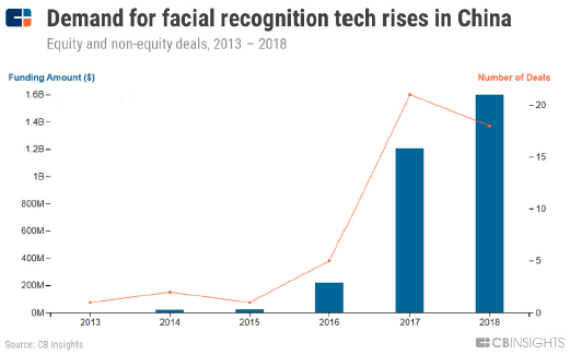 随着政府在监控中增加了一层人工智能,初创企业在为政府提供基础技术方面发挥着关键作用。在CBInsights平台上快速搜索中国的人脸识别初创公司的交易,反映了对该技术的需求。