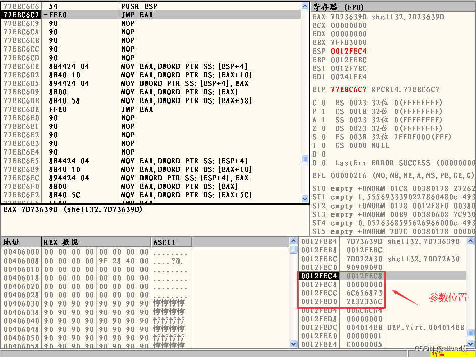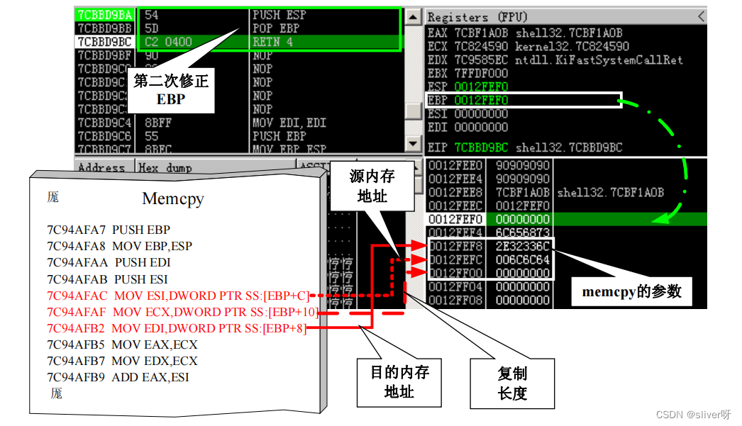 执行PUSH操作后,ESP指向0x0012FEF0处,只需要POP两次,就可以使得ESP指向EBP+0x14的位置,所以JMP EAX中的EAX应该指向类似POP POP RETN的指令序列。然后再EBP+0x14处放置memcpy函数的切入点0x7C921DB3,这样程序就可以转入memcpy函数中执行复制操作了。
