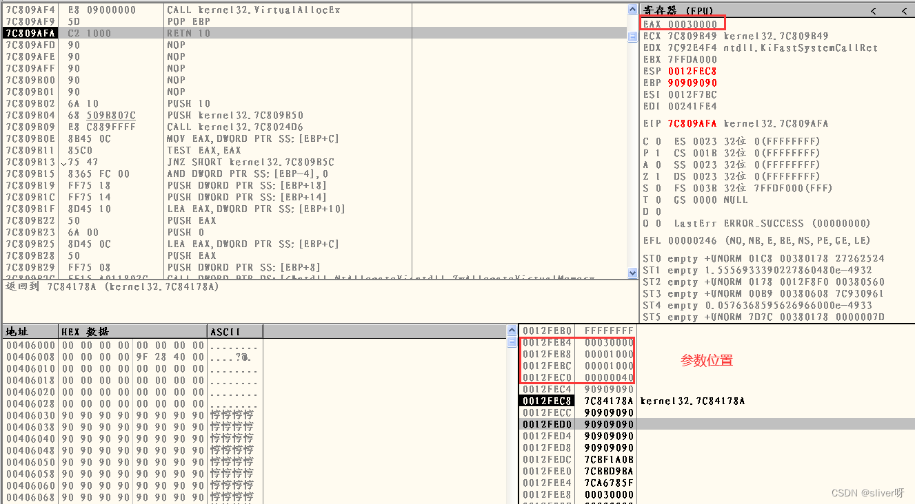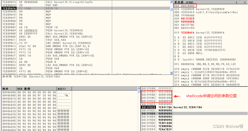 然后按照VirtualAlloc函数的参数布置一个能够申请可执行内存空间的shellcode,shellcode如下所示: