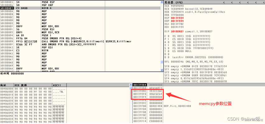 注意到:EBP+8、EBP+C、EBP+10保存着memcpy的三个参数。我们现在要改变EBP+C的值,也就是让ESP指向0x0012FEF0,再用PUSH RETN就可修改源内存地址这一参数了。