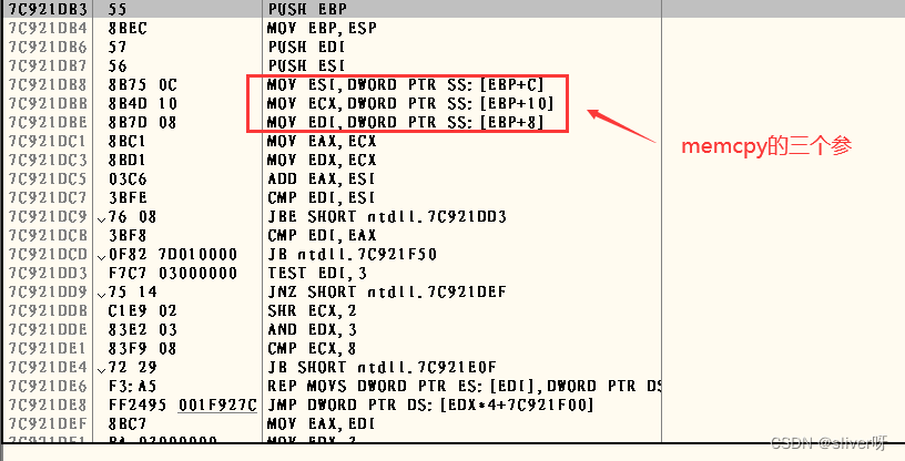 可知memcpy在0x7C921DB3处。memcpy函数的切入点为0x7C921DB8处。
