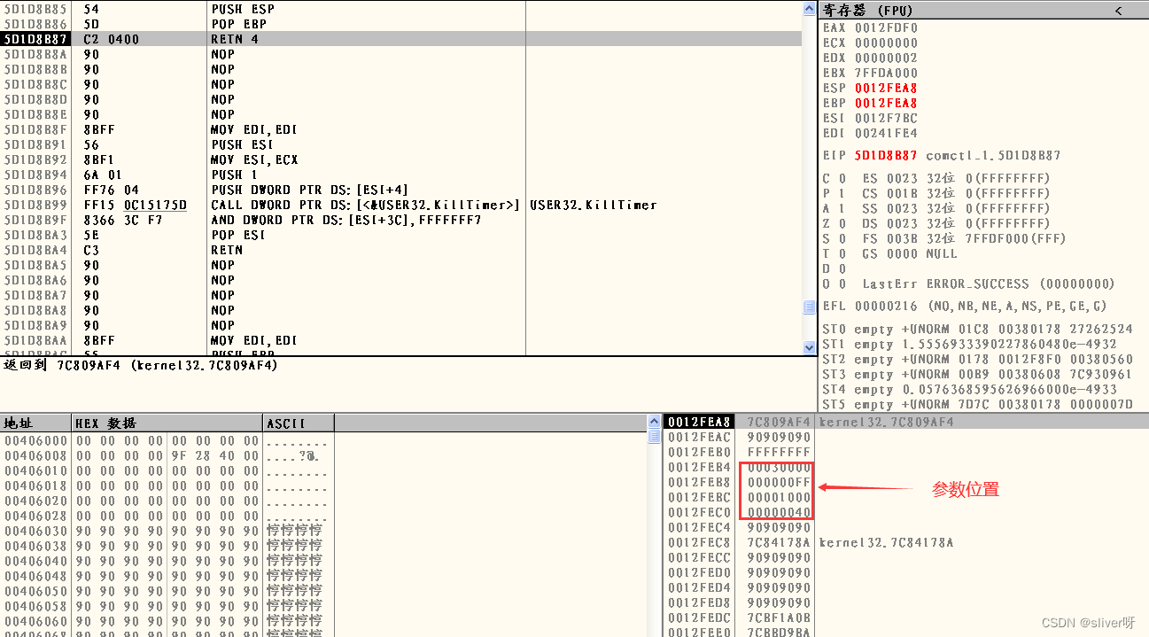(4)flProtect=0x00000040,内存属性设置为可读可写可执行,该属性对应的代码为0x00000040。