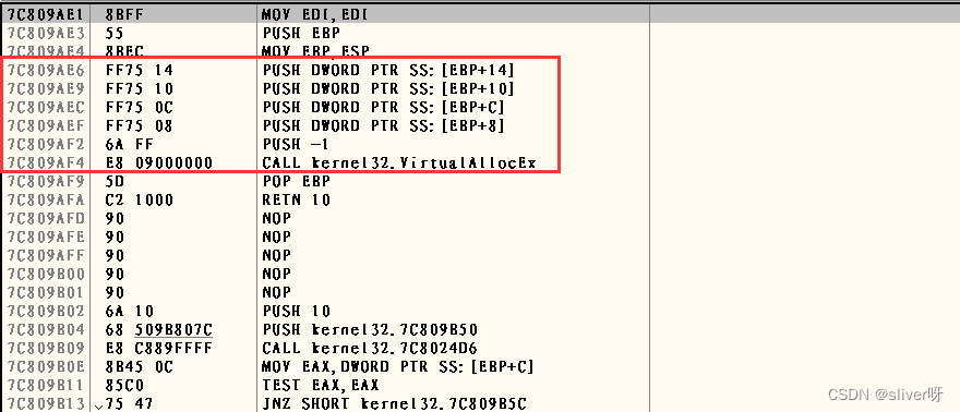 可以看到各个参数的入栈顺序,已经对应的入栈指令。