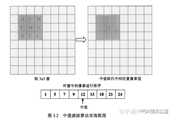 将 33 滑动块中的灰度值进行排序,然后用排序的中间值取代 33 滑块中心的值。示意图如下图所示。
