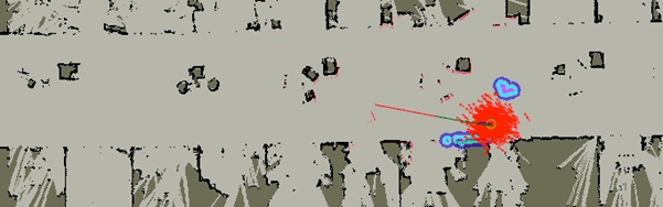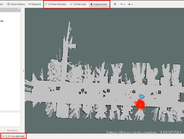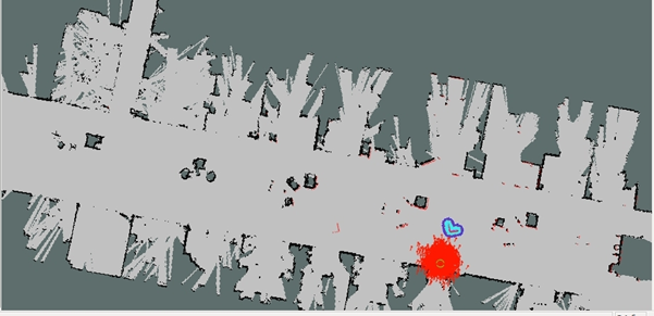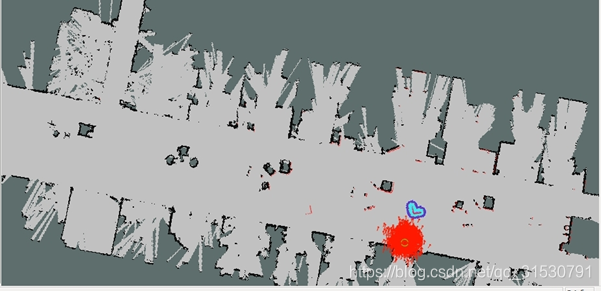 正常情况下,会打开可视化界面,并呈现出地图。图中的红色是机器人所在位置。