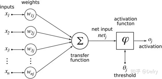 简单来说,一个人工神经元就是接受一个或者多个输入(训练数据),对它们加和,并产生一个输出。一般来说,这里面的加和指的是加权求和(每个输入乘上权重,并加上一个偏差),然后将加和的输入传递给一个非线性函数(一般称作激活函数或者转移函数)。