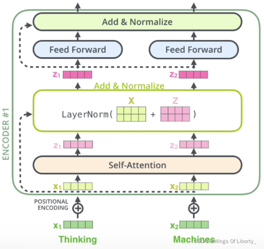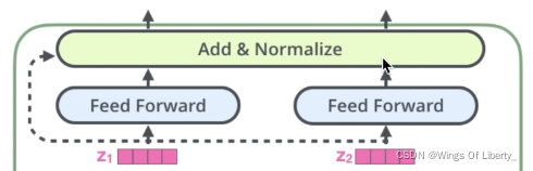 假设多头注意力部分有两个头,那么输出的两个注意力头Zi分别通过两个Feed Forward(由两个全连接层构成的网络:Linear(ReLU(Linear(Zi)))),然后接一个残差链接,即Zi和Feed Forward的输出Add对位相加。最后把相加的结果进行一次LN标准化。