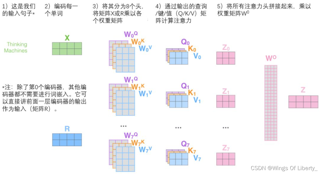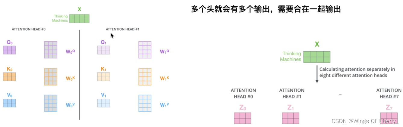 权重矩阵。把同一个句子利用多组不同的Q、K、V权重矩阵相乘,最后把得到的8个Z0~Z7对位相加(或者拼接起来再乘一个权重矩阵