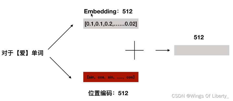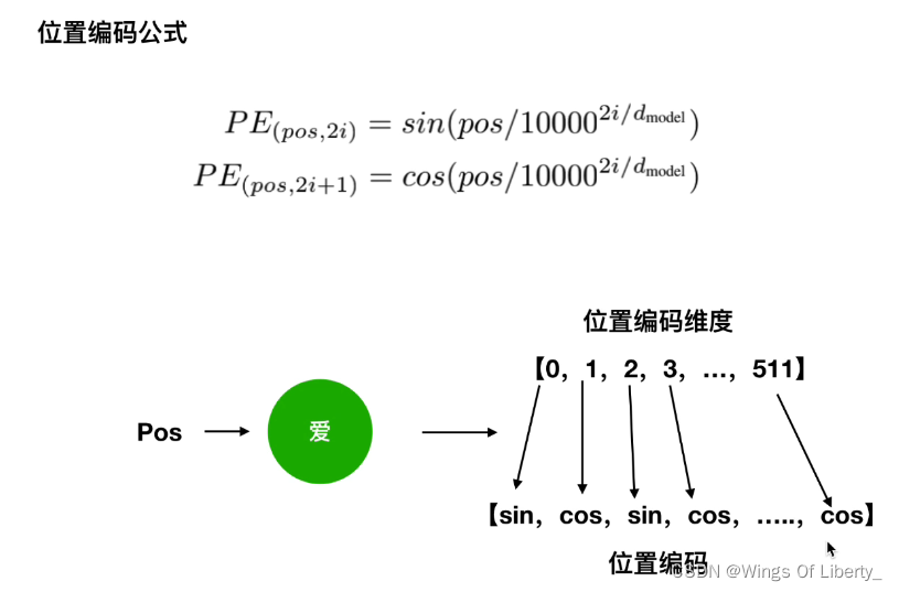 计算位置编码用的是上图中的公式。假设“爱”是当前的pos,“爱”这个字用512维的词向量Embedding表示。d_model等于词向量的维度,即512。i代表的是这512个数字的位置号,每个数字都有自己的位置编码。至于为什么公式里要采用正弦余弦的形式,可以参考以下文章(Transformer 中的 Positional Encoding