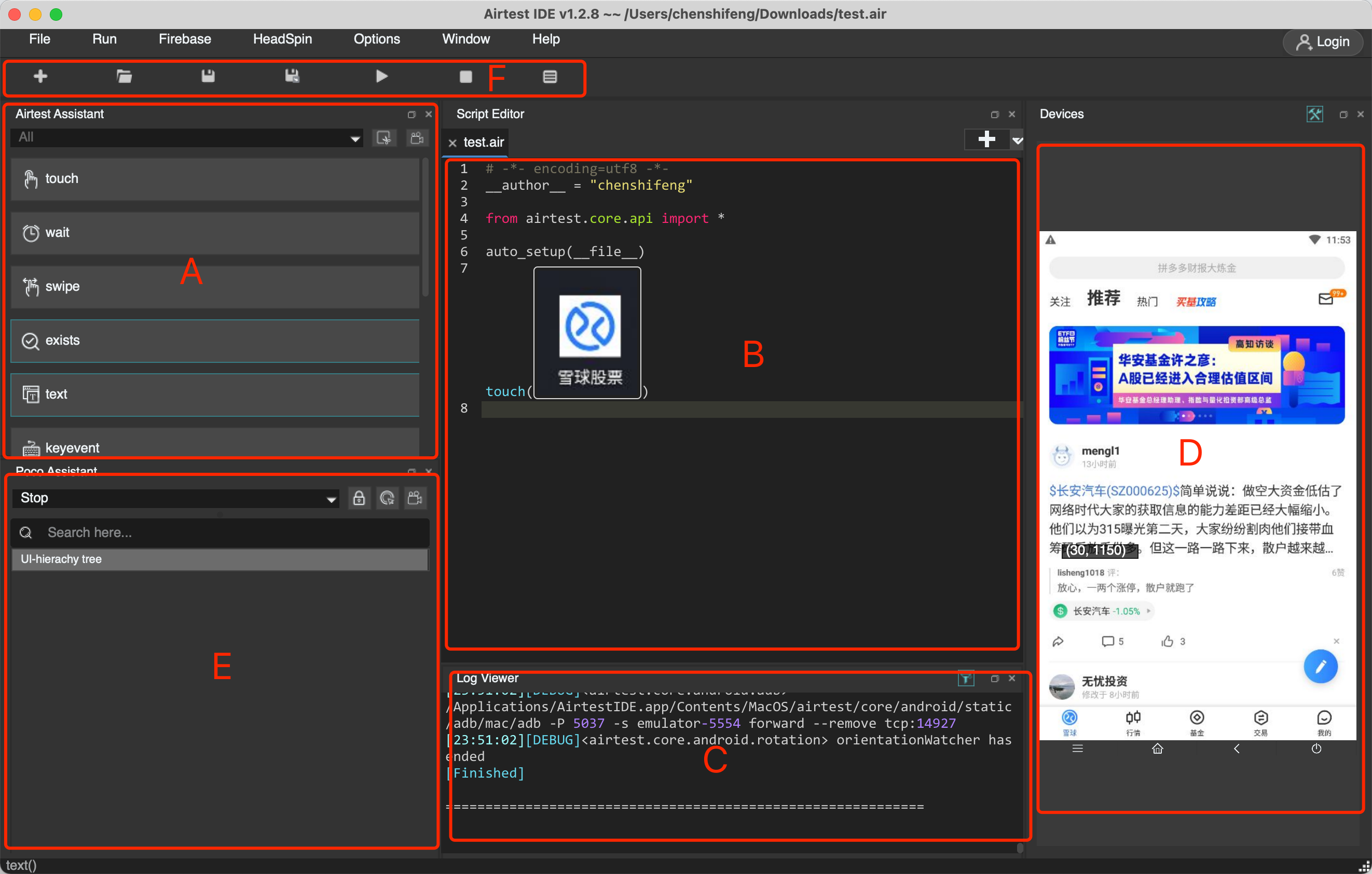 这里,我把Airtest分成了A-F6个区域,他们的功能如下: