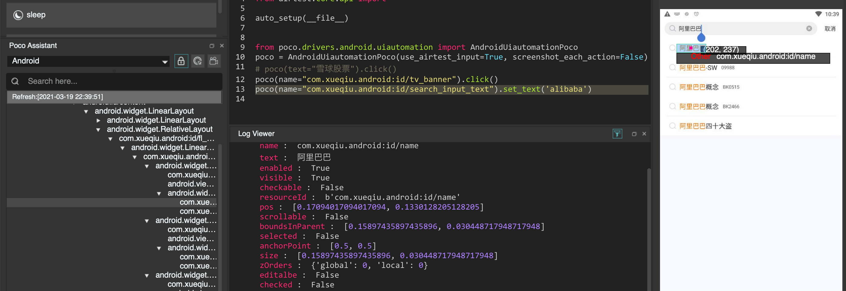 进入搜索结果以后,需要查看下面的各种即如果,此时就需要不断向上滑动屏幕。这里有一点需要特别注意,Airtest只能获取当前屏幕上的元素布局信息,不在屏幕上的内容是无法获取的。