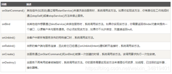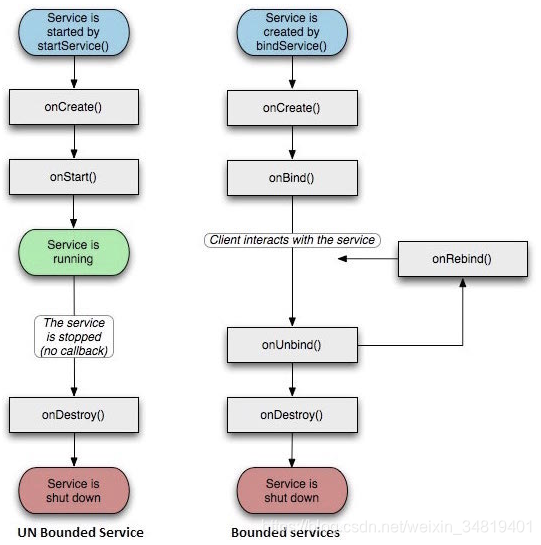 3.bindService启动服务的生命周期与其绑定的client息息相关。当client销毁时,client会自动与Service解除绑定。当然,client也可以明确调用Context的unbindService()方法与Service解除绑定。当没有任何client与Service绑定时,Service会自行销毁。