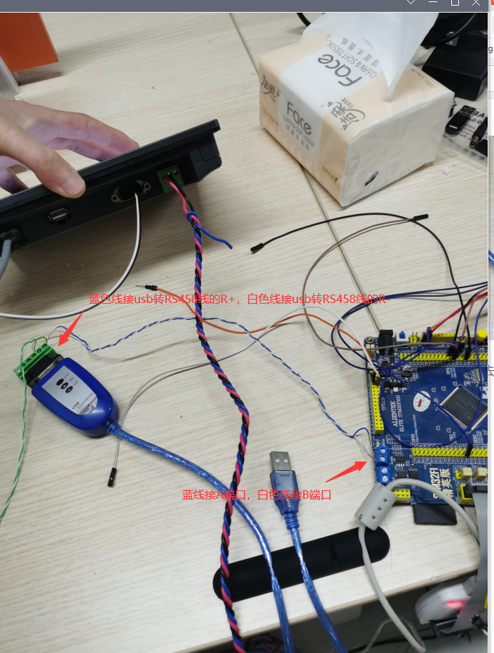 3、同理可得,如果是stm32f103与usb转串口的485的接头,用电脑当做主机调试程序,则是开发板的A端口接R+,B端口接R-。