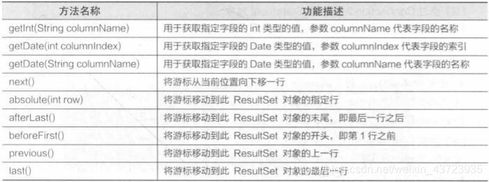 用于保存JDBC执行查询时返回的结果集,该结果集封装在一个逻辑表格中。在ResultSet接口内部有一个指向表格数据行的游标(或指针),ResultSet对象初始化时,游标在表格的第1行之前,调用next()方法可以将游标移动到下一行。如果下一行没有数据,则返回false。在程序中经常使用next()方法作为WHILE循环的条件来迭代ResultSet结果集。